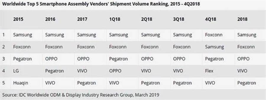 而三星、OPPO、vivo 不同於其他手機品牌,走的是自產自銷的路線,旗下都擁有廣大生產線。以三星來說,2018年除了第四季之外,另外三季都是智慧型手機代工廠出貨第一名,唯有在第四季短暫被富士康超越;而 iPhone 出貨向來都在第四季最高,也反映在和碩的組裝出貨量上(2018第四季排名第三)。