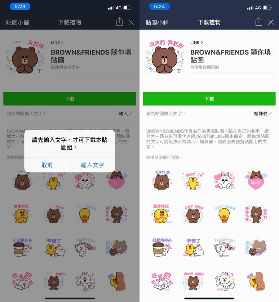 根據編輯體驗,全新的「 隨你填貼圖」跟一般 LINE 貼圖不同的是,需要先填寫一組特別的關鍵字(最多四字)後才可順利下載,而下載後可以無限次更新關鍵字,目前只支援 iOS 以及 Android 系統。而據了解,Mac 以及 Windows 都還不能支援,如果透過手機版 LINE 傳送了「 隨你填貼圖」給朋友,對方也只能在手機上看到填入關鍵字的貼圖,若是在電腦上觀看,還無法感受到這一組貼圖的魅力。