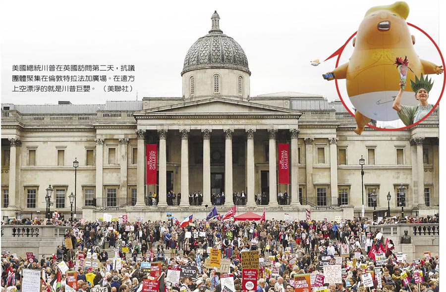 美國總統川普在英國訪問第二天,抗議團體聚集在倫敦特拉法加廣場。在遠方上空漂浮的就是川普巨嬰。