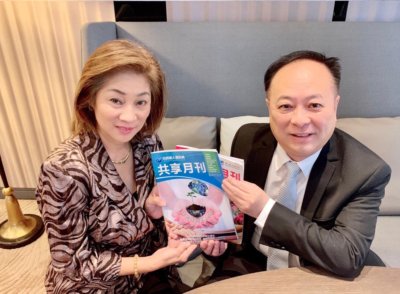 張學舜董事長接受「巴西華人資訊網」駐巴西東北地區事務代表陳林幸昭(左)致贈的《共享月刊》雜誌時表示:敬佩臺僑在海外僑居地的努力與成就,他歡迎大家「有空多回故鄉臺灣來看看。」