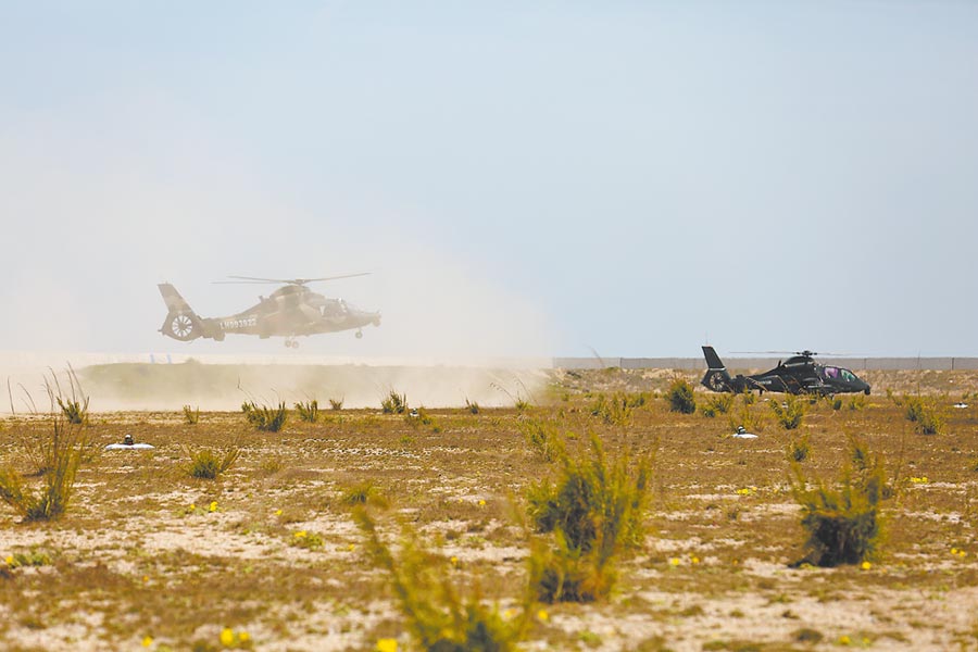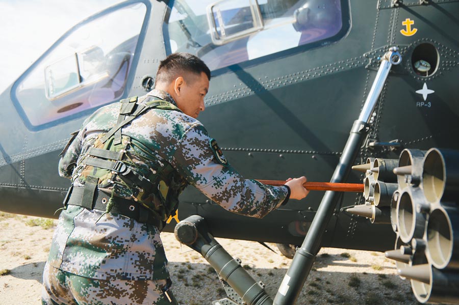 2018年4月18日,解放軍陸軍航空兵部隊在東南沿海舉行跨晝夜海上實彈射擊演練,軍械員在為新型武裝直升機裝彈。
