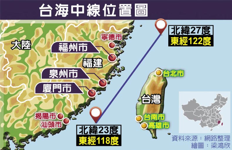 據了解,依主流說法,海峽中線起初為美國所建議劃定的一條互不侵犯的假想中線,國軍以此建立中華民國防空識別區,用以防衛台灣領空與領海,但大陸秉持其政治立場,向來不承認「海峽中線」的概念。