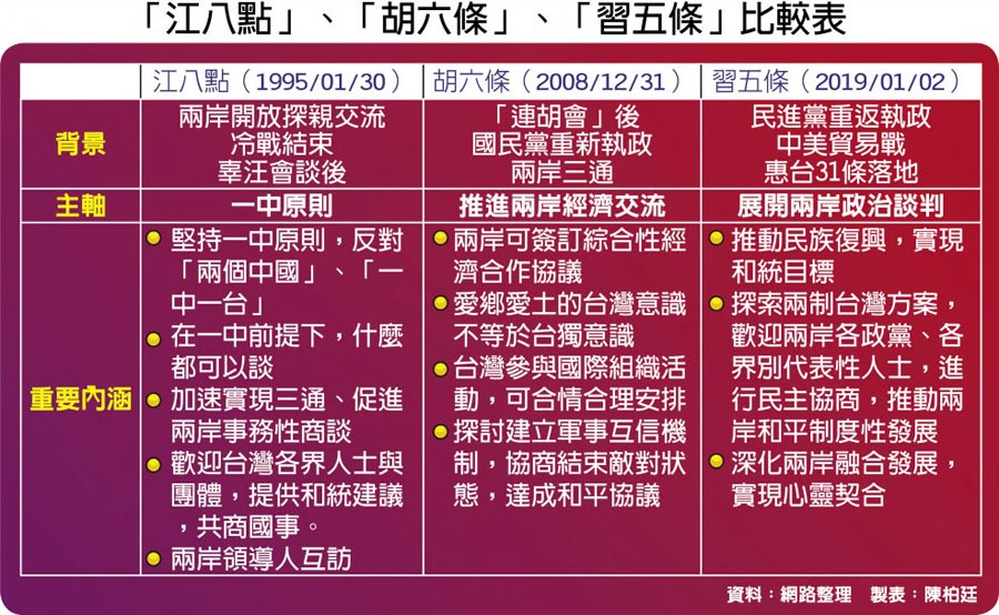 中共建政70年,期間對台政策既有延續性,也因國際及兩岸關係變遷有所變化。《告台灣同胞書》堪稱大陸對台最早政策性文件;1995年「江八點」拋出兩岸可開啟談判訊號;2008年「胡六條」奠定兩岸經濟交流制度化;推動兩岸政治談判進程的「習五條」在今年提出後,成為新時代對台政策綱領。