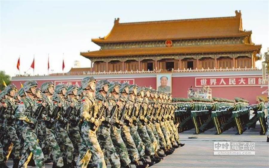 中國大陸閱兵徒步部隊在北京天安門廣場前演練。