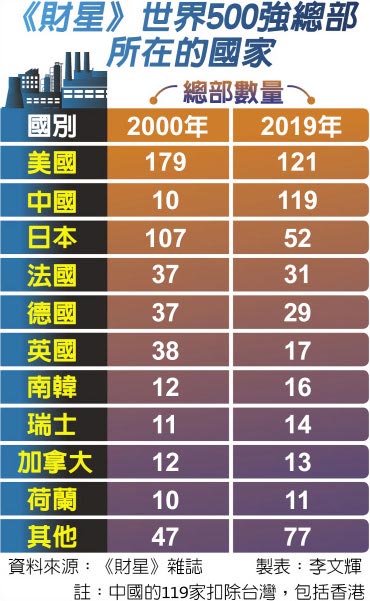 據統計,FG500企業總部位於美、日、德、英、法、義、加等七國集團(G7)國家的數量,已從2000年的420家銳減至2019年的269家。
