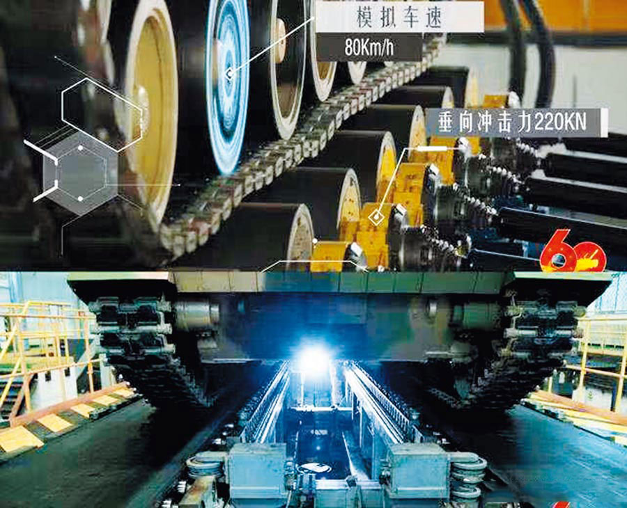 這款7對輪履帶底盤正在台上測試,試驗台可模擬80公里/時的車速;還可設置多種模式,產生強大衝擊力,模擬高速越野時的衝擊,即時監測底盤和懸掛的振動參數,為優化設計提供依據。