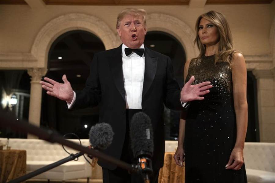 參加新年晚會前,美國總統川普與夫人梅蘭妮亞接受媒體訪問。