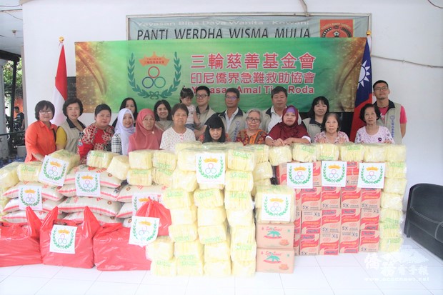 由印尼台商組成的三輪慈善基金會今天致贈白米等多項民生物資給位於雅加達西區的養老院,讓弱勢的朋友感受來自台灣的溫暖。
