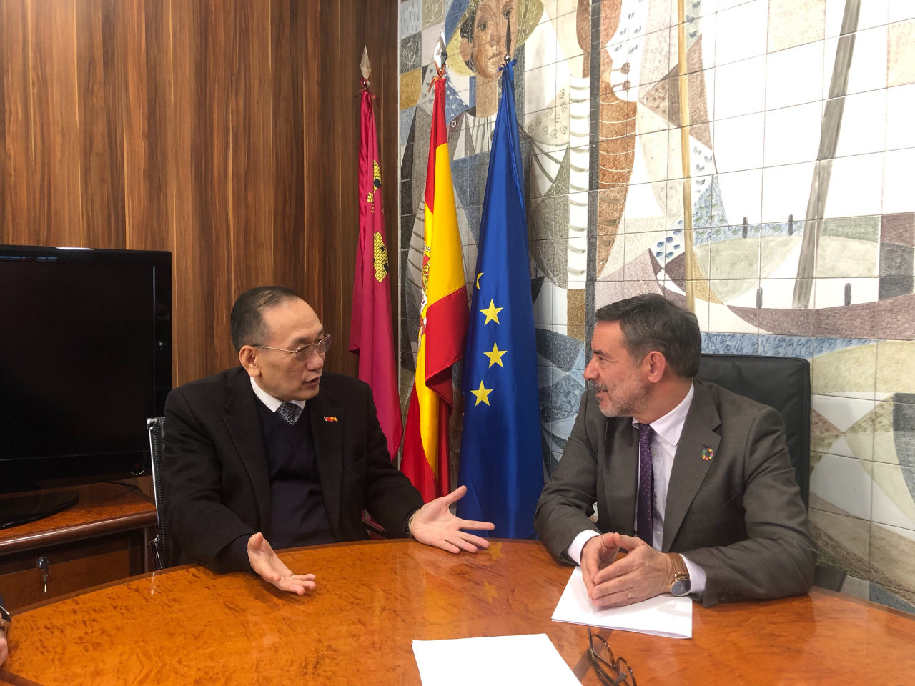 駐西班牙代表處劉大使德立應西國穆爾西亞自治區(Murcia)主席Francisco López Miras之邀請於1月16日赴該自治區以「臺灣:新商貿契機」為題進行演講及舉辦座談會,並與該自治區主席Francisco López Miras及Murcia省長Francisco Javier Jiménez Jiménez就加強雙邊實質關係交換意見。