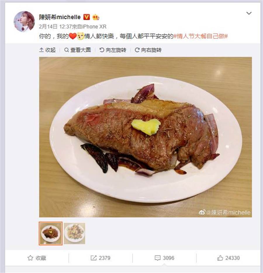 適逢一年一度的西洋情人節,人妻陳妍希化身主廚,在微博曬情人節大餐照,有牛排和炒蝦仁,兩道美食都是色香味俱全,其中牛排更是藏了亮點,上頭還有黃色愛心圖案,陳妍希低調曬恩愛,吸引網留言:「和陳曉要幸福」、「陳曉一定要珍惜妳」、「情人節快樂」。