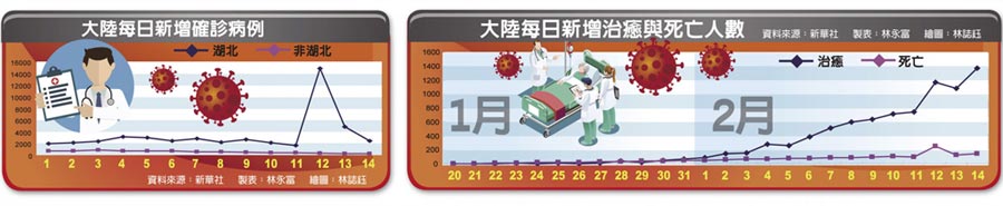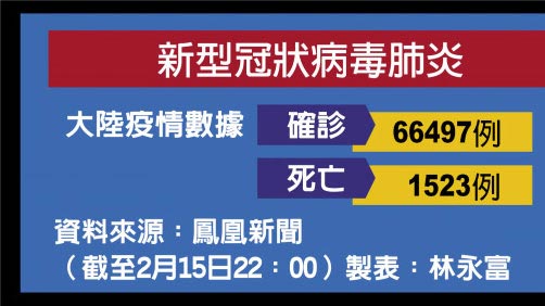 據大陸國家衛生健康委員會15日公布的數據,14日全國新增確診病例2641例,新增死亡病例143例(湖北139例,河南2例,北京、重慶各1例)。全國累計報告確診病例6萬6492例,死亡病例1523例。