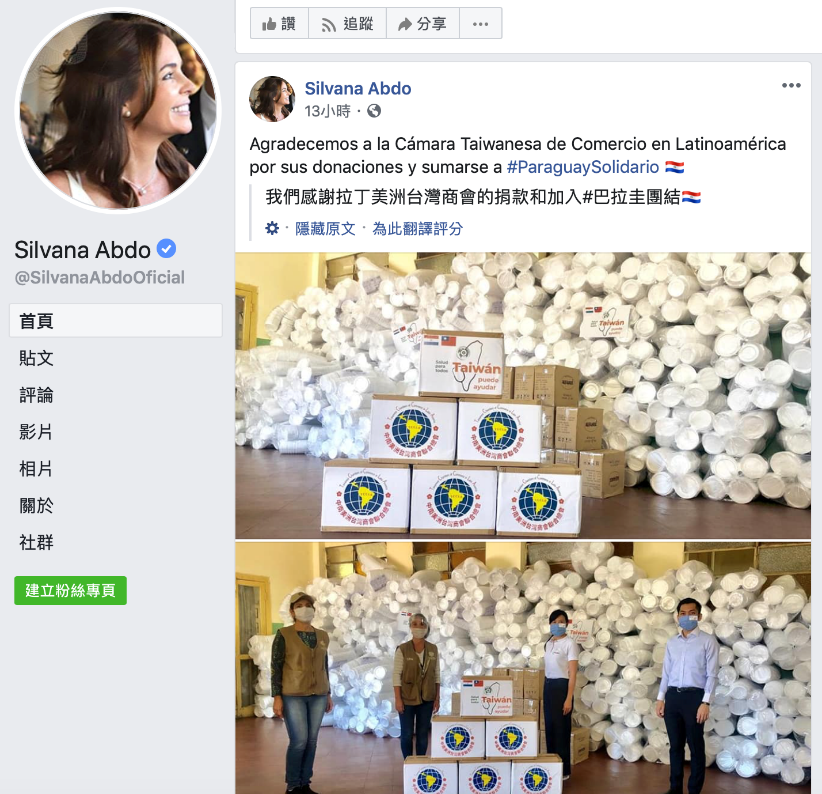 第一夫人席凡娜女士(Silvana Abdo)在個人臉書感謝中南美洲南灣商會聯合總會的捐獻