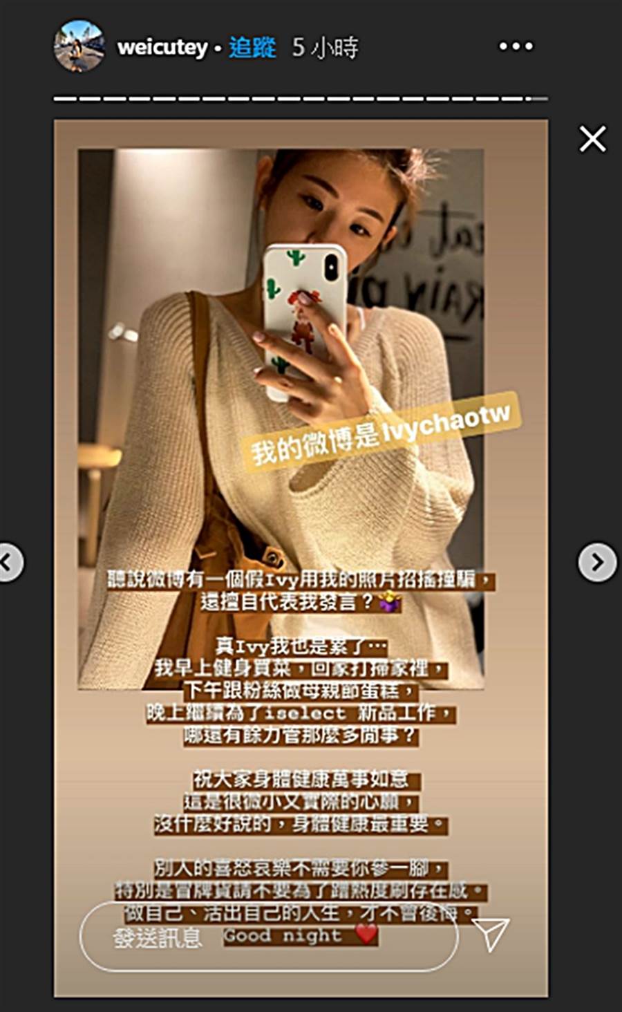 對此,趙筱葳稍早在IG回應:「聽說微博有一個假Ivy用我的照片招搖撞騙,還擅自代表我發言?」並說自己忙了一整天,「哪還有餘力管那麼多閒事?」,「別人的喜怒哀樂不需要你參一腳,特別是冒牌貨請不要為了蹭熱度刷存在感。做自己、活出自己的人生,才不會後悔」,最後澄清自己的微博帳號是「Ivychaotw」,不是「weicutey」。