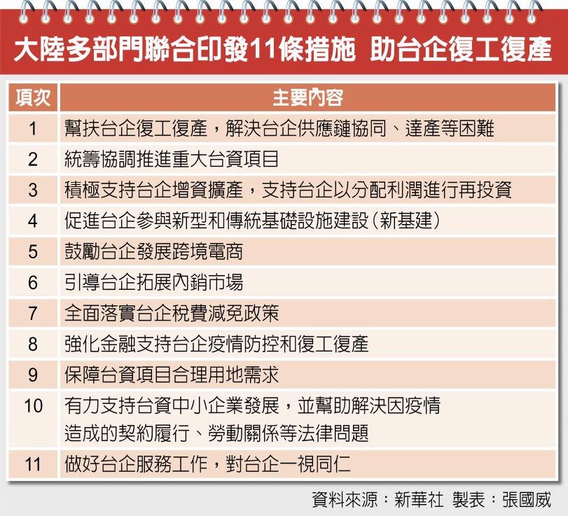 陸委會昨表示,11條措施多為原則方向性內容,呼籲大陸具體落實對台商復工復產、投資及權益保障,而非口惠而實不至的政治統戰宣傳。