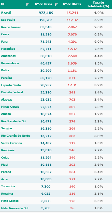 根據G1媒體對巴西各州衛生部門調查顯示,截至昨天週三(17日)巴西全國共有45467 例死亡,929149 例確診病例。