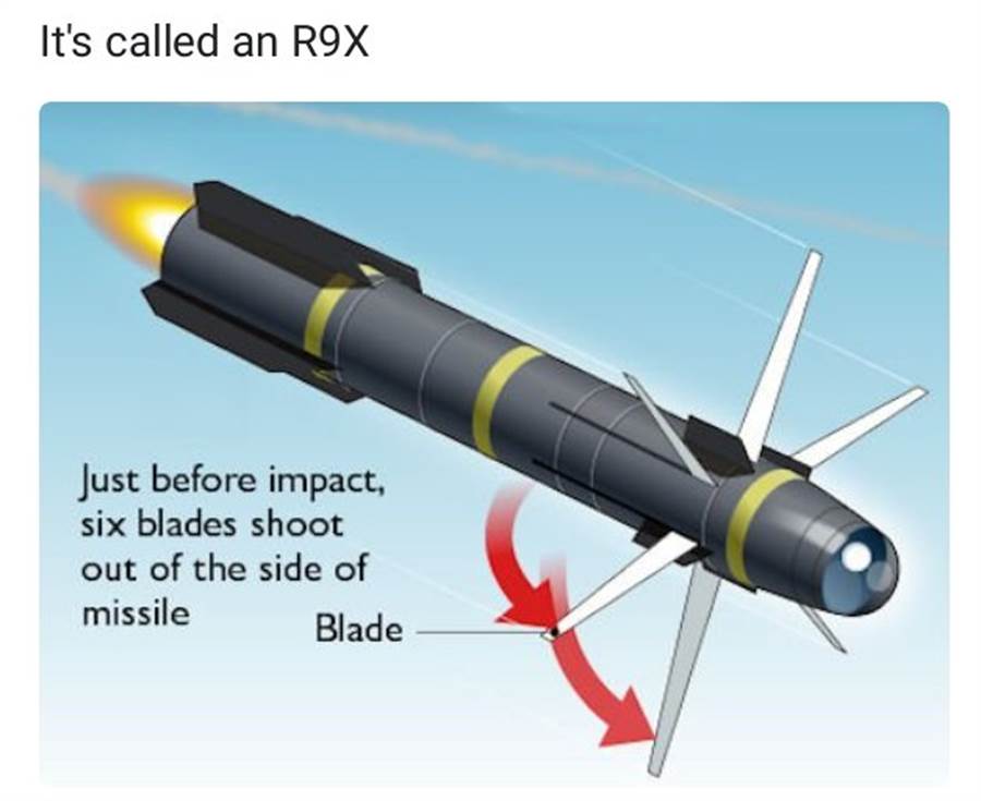 軍事時報(Military Times)報導,忍者炸彈也稱「飛刀炸彈」(Ginsu bomb),已知代號是R9X ,是一種以AGM-144地獄火飛彈為基礎,取消其高炸藥彈頭,改用6片劍狀刀片,可以輕鬆突穿建築物或汽車,卻不會發生爆炸而波及四周。