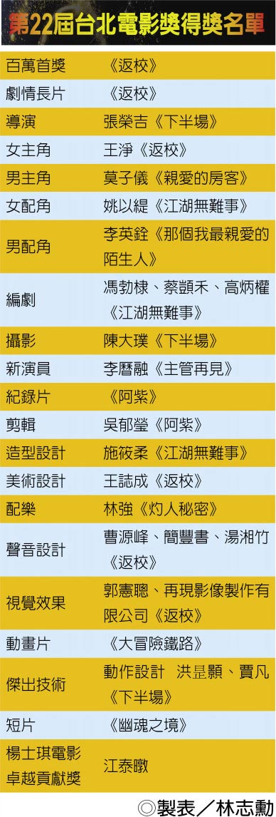而去年票房破億的超夯國片《返校》在本屆台北電影獎入圍12獎,風光拿下包括百萬首獎、劇情長片、女主角、美術設計、視覺效果、聲音設計共6獎,此外也獲會外賽的電影行銷獎,成為本屆得獎大贏家。李烈從玉女明星到監製一姊,第一次以監製的身分獲獎,對她來說意義非凡,「謝謝評審和北影,我們很清楚一部電影會成功,不是一個人的功勞,是全體的功勞,謝謝所有幕前、幕後的工作人員,也謝謝赤燭遊戲的團隊,甚至於是對電影有一點點幫助,我們都謝謝你們。這個獎是屬於大家一起的。」