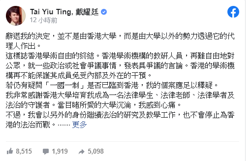 戴教授在臉書上說:「辭退我的決定,並不是由香港大學,而是由大學以外的勢力透過它的代理人作出。這標誌香港學術自由的終結。香港學術機構的教研人員,再難自由地對公眾,就一些政治或社會爭議事情,發表具爭議的言論。香港的學術機構再不能保護其成員免受內部及外在的干預。」