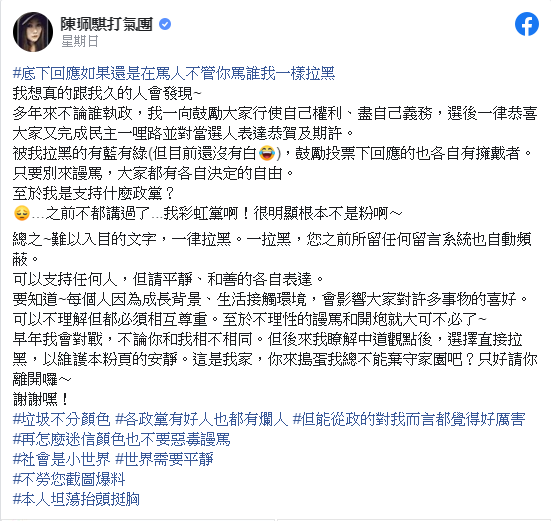 未料陳珮騏一PO文,就受到一些網友攻擊,讓她事後無奈再發聲:「多年來不論誰執政,我一向鼓勵大家行使自己權利、盡自己義務,選後一律恭喜大家又完成民主一哩路並對當選人表達恭賀及期許。」