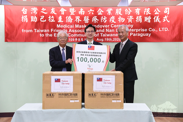臺灣之友會總會長黃崑虎及南六企業股份有限公司董事長黃清山透過巴拉圭僑務委員江昭萱了解,巴拉圭地區僑胞因新冠肺炎(COVID-19)疫情使得對於口罩的需求遽增,為體現Taiwan Can Help及關懷世界的精神,黃崑虎及黃清山共同捐助10萬片臺灣製口罩給巴拉圭的僑胞,雙方於8月19日在僑務委員會舉辦捐贈儀式,並由僑委會委員長童振源見證,同時呼籲各界發揮愛心,共同度過這場肆虐全球的疫情。現場包括僑委會副委員長徐佳青、主任秘書張良民、外交部拉丁美洲及加勒比海司司長俞大㵢、臺灣之友會執行長蔡淑美、泰國僑務諮詢委員何素珍共同到場見證。