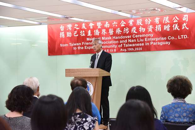 童振源感謝臺灣之友會號召南六企業股份有限公司共同捐贈醫療用口罩給巴拉圭僑胞,希望每一片口罩都可以代表臺灣的一片愛心,讓大家可以順利度過疫情難關
