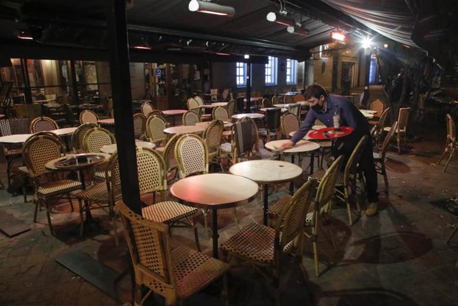 法國16日新增逾2.5萬人確診,累計染疫人數逼近83.5萬,巴黎等地準備再度實施宵禁。圖為巴黎的路邊咖啡館,在宵禁規定下只能早早打烊。