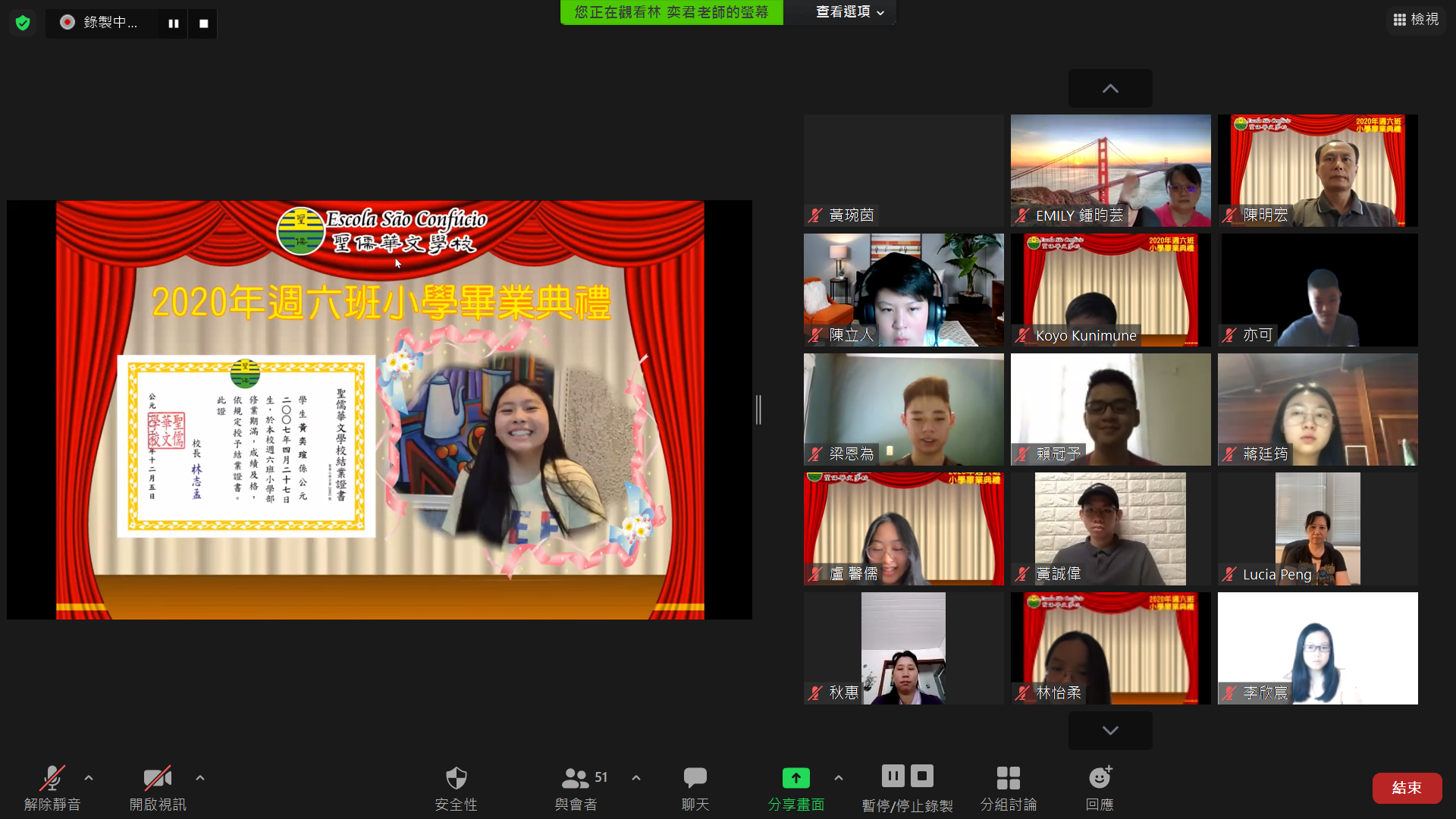 聖儒華文學校11月28日上午10時至12時舉行2020年平日幼教部暨週六班小學部線上畢業典禮,來賓、師生、家長約230位參加,共同恭賀幼教部39名、小學部33名畢業生完成階段性學習任務。