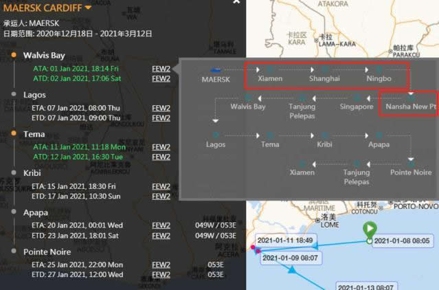根據大船期數據顯示,該輪事發前曾掛靠國內的廈門、上海、寧波、南沙新港等港口;除了MAERSK,共艙的船公司還有APL、CMA CGM、CNC、MCC、SAFMARINE、SEAGO、SEALAND。