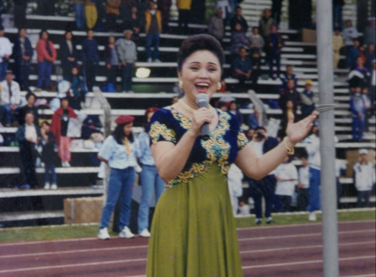 陳黃淑英在華僑運動會上演唱自己譜曲的運動會歌
