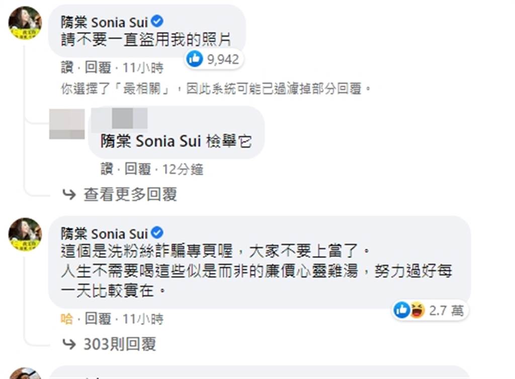 如今,隋棠忍無可忍,進一步到「隋棠說」粉專po文底下留言,先是直接嗆明:「請不要一直盜用我的照片」,接著又留言告訴大家,這個是洗粉絲的詐騙帳號,提醒眾人別上當,並直接怒嗆:「人生不需要喝這些似是而非的廉價心靈雞湯,努力過好每一天比較實在」。