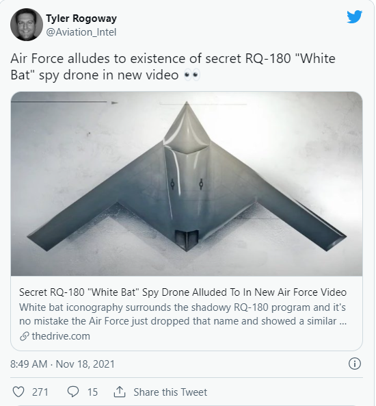 這時畫面隨即切換,出現了1架隱形飛翼高空長航時無人機的影像,酷似《航太周刊》(Aviation Week)先前所披露的RQ-180。隨後有好些消息人士說,它暱稱為「大白蝠(Great White Bat)」和「白蝙蝠(Shikaka)」。而Shikaka在金凱瑞(Jim Carrey)1995年的喜劇片《王牌威龍2》(Ace Ventura 2)中,就是一隻神聖的白蝙蝠。