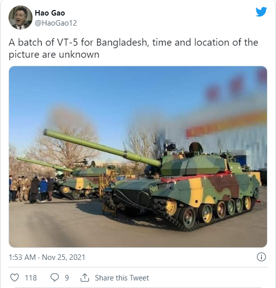 根據推特著名軍事情報家Hao Gao在11月24日的貼文,中國大陸準備交付第一批 VT-5輕型戰車給孟加拉。照片被模糊化處理,地點不明。