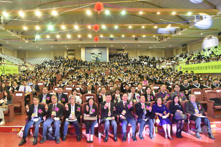 第39期海外青年技術訓練班承辦學校包括銘傳大學、中國文化大學、崑山科技大學、龍華科技大學、宏國德霖科技大學、中華大學、弘光科技大學、靜宜大學、南開科技大學、東南科技大學、樹德科技大學、環球科技大學及國立屏東科技大學,童振源親自頒發承辦學校績優專責人員、資深人員及學行優良學生等獎項,最後由各校師長頒發畢業證書予各校學生代表,場面盛大而溫馨,為海青學子在臺求學時光畫下完美句點。