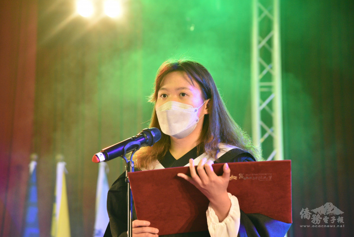 來自馬來西亞的崑山科技大學劉蓓靜同學代表向各校師長致答謝詞,感謝師長照顧教導及身旁同學一路相伴。