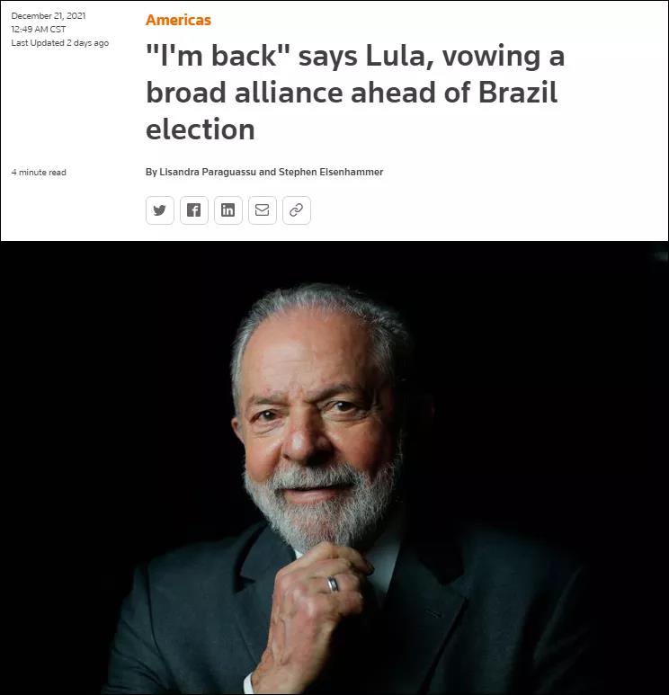 路透社20日報導,2022年10月2日,巴西將舉行總統大選。盧拉12月17日在位於聖保羅市的辦公室接受採訪,談及他自己的未來時,盧拉直截了當表示:“我回到了遊戲(政壇)中。我想玩,我想贏。”盧拉表示,他若當選總統,政府將提供更加公平的財富分配,縮小社會貧富差距,並建立一個廣泛的聯盟,團結深度分裂的國家。