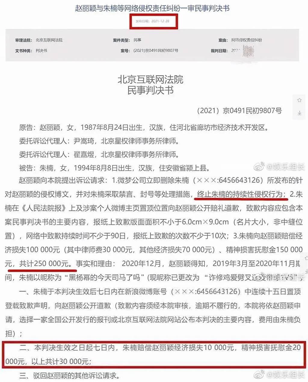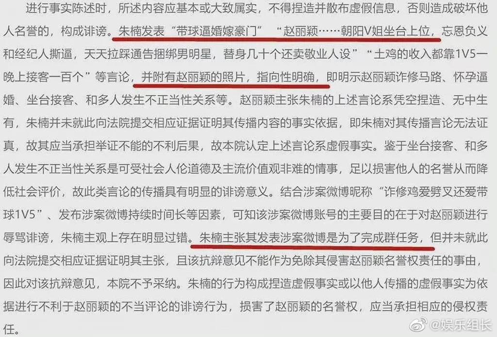 近日,法院一審判決出爐,判定朱姓網友上訴言論指向性明確,還附上了趙麗穎照片,具有明顯的誹謗意義,朱姓網友卻主張涉案微博是為了完成群任務,然而未提供相關證據,且抗辯意見無法作為侵害趙麗穎名譽權脫罪的理由,最後判朱姓網友在7天內賠償趙麗穎3萬人民幣,並置頂道歉文15天,而文中可見該網友稱:「我非常感激您(趙麗穎),考慮到我家境貧困,全年收入微薄,您在了解情況後,對我免除經濟賠償」,一語引來其他網友回應:「在群裡不是很嘴硬嗎?」、「每次都家境貧寒,每次都免除賠償,有幾個是真的家境貧寒?」、「這麼喜歡說家裡窮?那就祝她家真的窮一輩子吧!」、「這就是貧困??用著蘋果,身在上海」。
