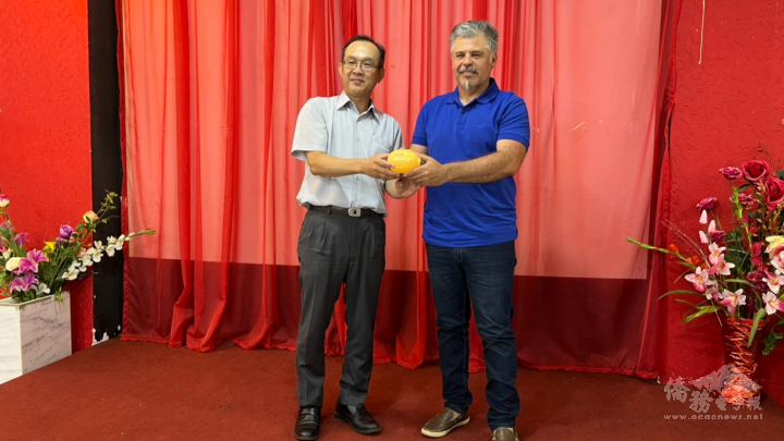 駐東方市總領事館總領事張俊彬代表蔡英文總統,再次致贈簽名小豬撲滿予巴國內政部長阿納爾多·吉佐