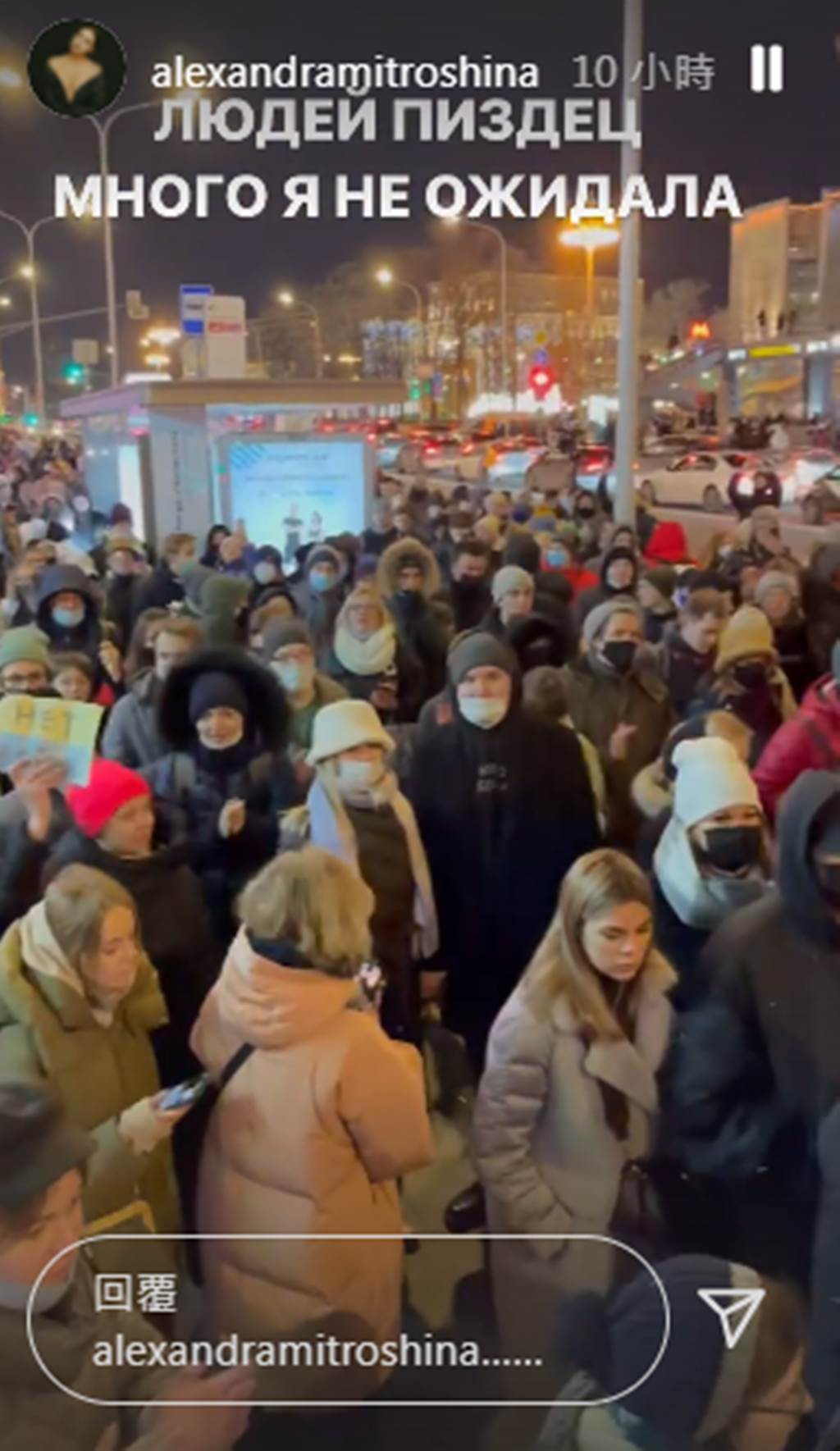 烏克蘭網紅佳娜在instagram限動轉發當地作家米特羅辛娜(Alexandra Mitroshina)的影片,只見上頭寫著「反對戰爭」的字句,接著看到俄羅斯民眾上街遊行,人多到將街頭擠得水洩不通,只見每個人表情沉痛不已,並向俄羅斯總統普丁喊話「能夠停止戰爭」,她也寫道:「俄羅斯人民上街抗議,希望普丁別打了,謝謝」,還附上落淚表情符號,足以見得內心的憂慮。