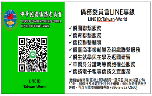 僑務委員會Line專線(ID:Taiwan-World)提供僑務事項諮詢、建言及服務;海外38個僑務據點專線提供各轄區僑務事項諮詢、建言及服務,各地區數位總機Line ID請上僑委會官網查詢,歡迎全球僑胞多加利用。