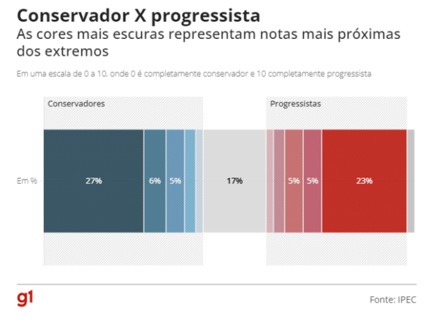 在受過高等教育(29%)、有色人種或非白人或黑人(30%)、沒有宗教信仰或不信奉基督教(30%)的選民中,完全進步人士的數量更高。在認為 現總統博索納羅政府糟糕或糟糕的人中,這一比例也更高(31%)。