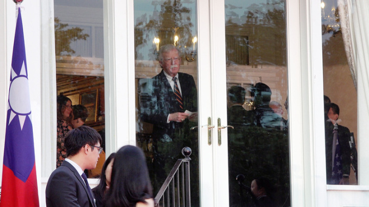 美國前國安顧問波頓(門窗邊)5日短暫出席駐美代表處舉辦的國慶晚會致意