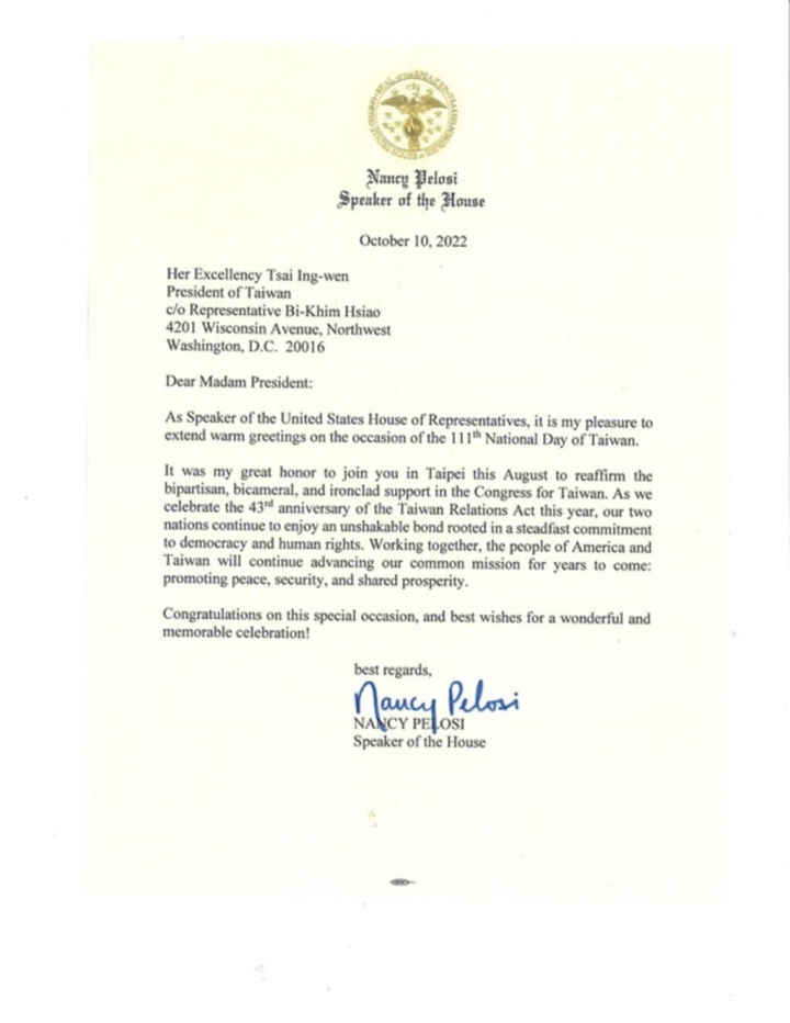 美國眾議院議長裴洛西致函總統蔡英文,祝賀民國111年國慶,強調美台兩國將持續享有不可動搖的連結