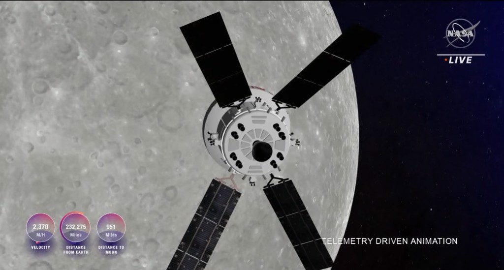 經過4天的航行,美東時間11 月 21 日上午 7 點 44 分(台北時間19點44分),獵戶座太空艙將在離月球表面約130 公里處航行,這也是最近距離。