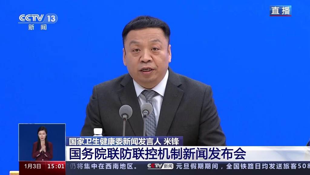大陸國務院聯防聯控機制於今天(1月3日)下午召開新聞發佈會,大陸國家衛生健康委新聞發言人米鋒表示,當前,中方疫情防控工作重心從「防感染」轉向「保健康、防重症」。