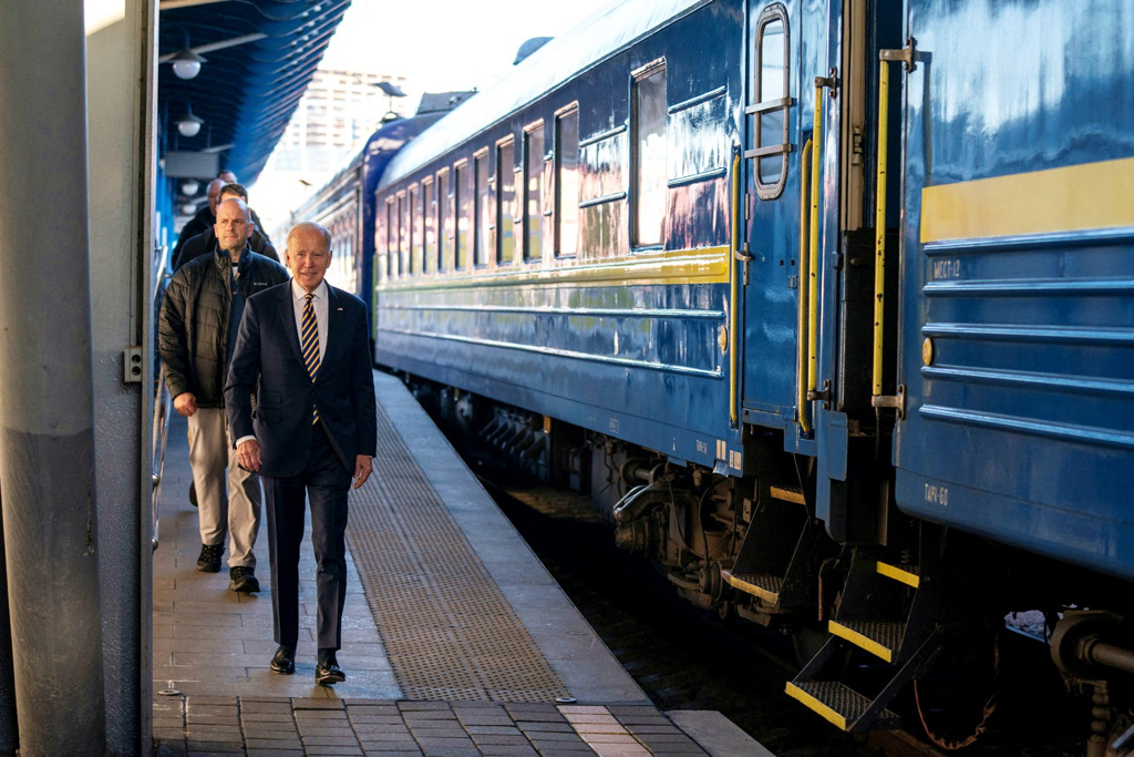 拜登結束23小時快閃基輔行前,先短暫停留美國駐烏克蘭大使館,之後再搭上火車返回波蘭,他搭乘的火車有木製車廂、餐桌及真皮沙發,窗簾全部拉下。