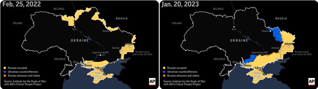 去年的2月24日,俄羅斯突然對烏克蘭發動「特殊軍事行動」,攻擊起始點是從白俄羅斯出發,佔領了車諾比、安東諾夫國際機場、外圍郊區市鎮等地區,目的是包圍首都。美聯社在推特上發布了一份新的縮時畫,顯示了過去一年的戰爭不斷變化的戰線,可看到俄羅斯在戰爭的最初幾星期,兵鋒佔領首都基輔有多近,以及烏克蘭如何守住戰線,並最終迫使俄羅斯撤退北部佔領區,並退縮到如今的地位。