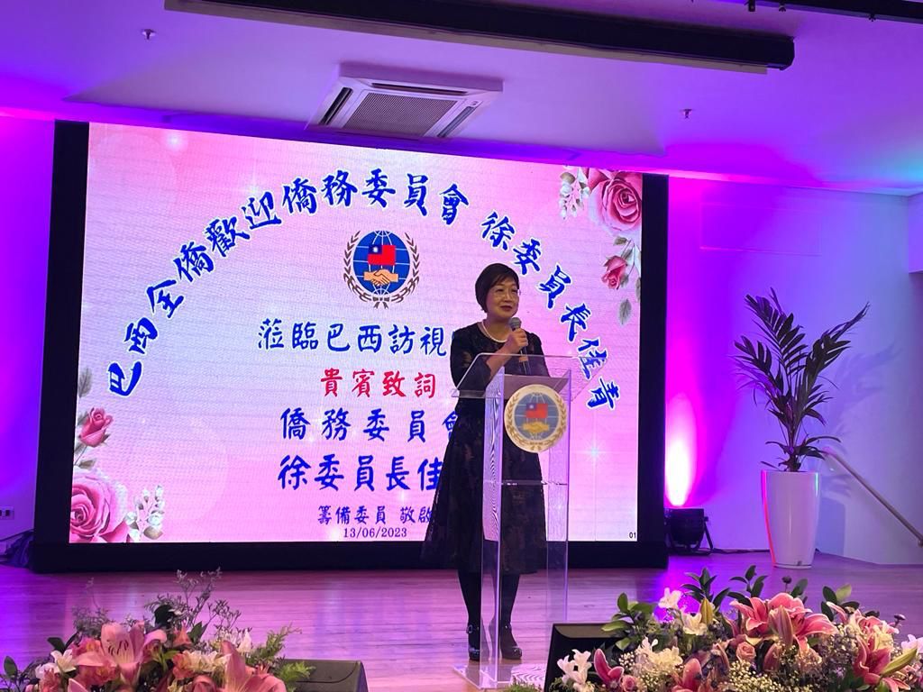 徐佳青委員長致詞時表示看到今天盛大的歡迎晚宴,讓她感受到巴西僑界的盛情。她說明僑委會今年重大政策,開始首度開辦僑生獎學金,鼓勵年輕人回台灣受高等教育。另開始推出頂尖獎學金,4年共104萬,所就讀的大學另再給50%的獎學金52萬,另國內及海外企業高度重視培育人才,加入聯名獎學金計劃,4年共可拿到260萬新台幣,讓優秀的年輕人在台灣讀書不用擔心生活費用。 除了頂尖獎學金之外,還有優秀獎學金4年40萬,加上聯名獎學金4年共高達100萬新台幣。 希望聖保羅的僑胞子弟可優先考慮去台灣讀書。謝謝僑界先進長期在巴西主流社會默默耕耘,做了許多社會貢獻,期待在未來,大家能夠持續保持活躍度,發揮更大的能量。