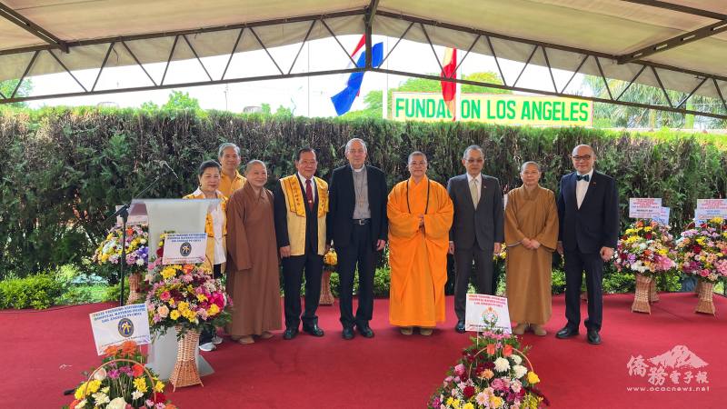 左起巴拉圭華人慈善基金會副會長張阿裡、監事長郭鳳文、巴拉圭佛光山監寺有光法師、名譽會長李雲中、上巴拉納教區主教 Monseñor Steckling、佛光山南美總住持妙佑法師、駐東方市總領事張俊彬、巴西海習飛佛光緣覺曦法師、駐巴拉圭公使郭炳宏