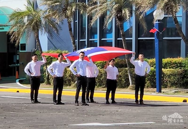 升旗典禮一開始,在所有貴賓手揮舞著國旗的期盼目光下,由6位在蘇比克地區臺商青年所組成的護旗團隊恭迎國旗進場,所有在場僑胞揮舞著手上國旗同時以目光迎接巨幅的青天白白日滿地紅國旗。國旗就定位後,大家一起齊聲高唱國歌,隨後在國旗歌的樂聲中,冉冉升起中華民國國旗,此刻讓全體僑胞的心沸騰到最高點。