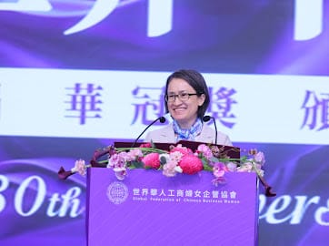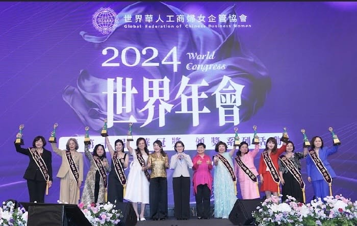 《廖世秉報導》世界華人工商婦女企管協會於10月14日下午在台北漢來大飯店隆重舉行第10屆華冠奬頒獎典禮,表揚全球傑出華商婦女的成就,有千餘位賓客前來觀禮,蕭美琴副總統親臨出席頒發本屆得主華冠獎青銅獎座,致詞勉勵。首先回顧歷屆華冠奬得主風采影片,接著華冠獎得主在大家熱情的歡迎聲中進入會場。